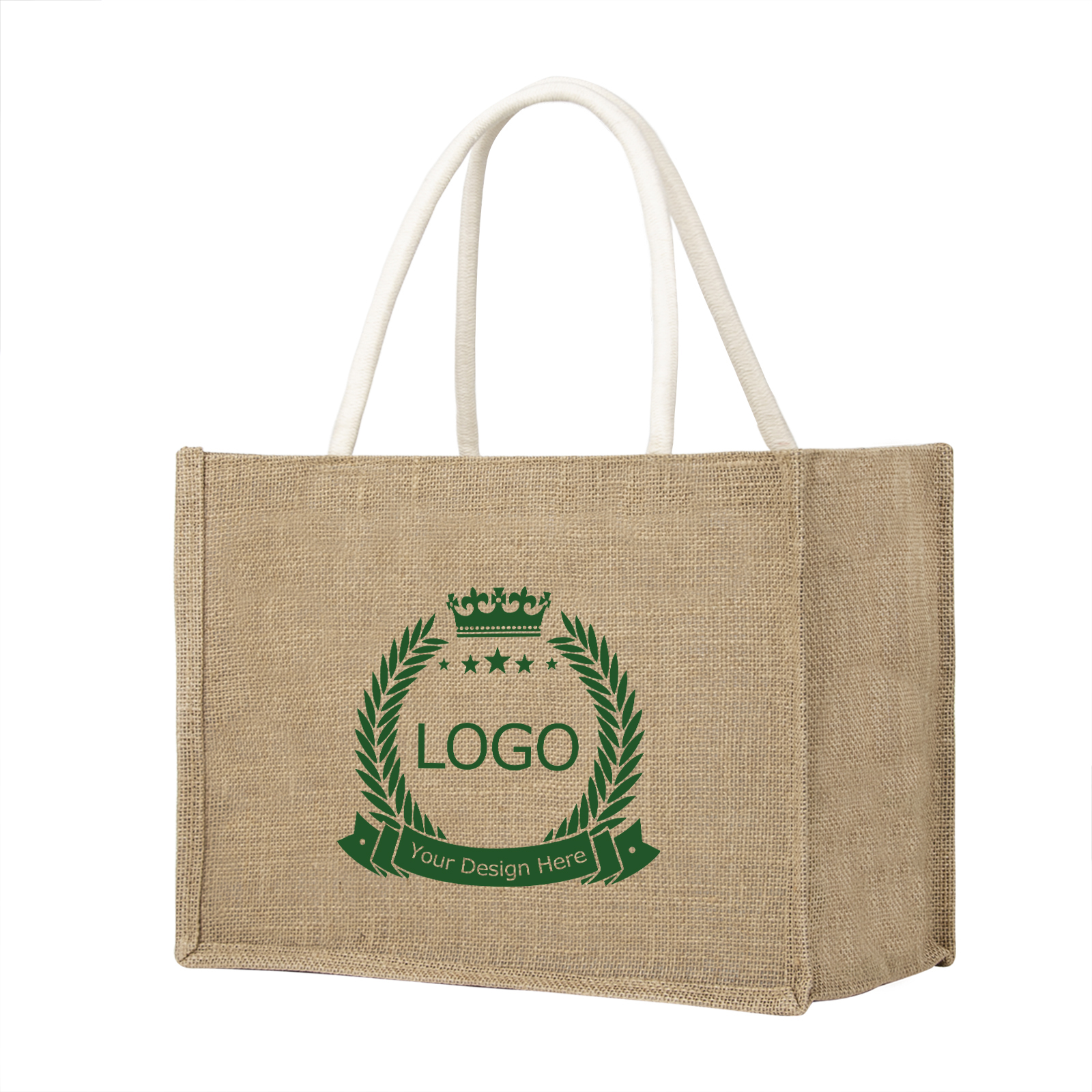 Custom your name, logo, artwork, slogan, greeting, date, number, saying, cartoon on it|Natural burlap and PVC film laminated interior, with sturdy rope handles and reinforced outer canvas piping|Large 15 L x 10.6 H x 6.3 W inches (38 x 27 x 16 cm). All lengths are including the cream piping. Please allow 0.5-1cm error of the bag size because they are made and measured by hand|Logo will be printed by heat transfer on 1 side, imprint area within 12*6 inches (30*15cm); stable and durable to use, all color allowed in your design|Good to be bridesmaid proposal bag, beach tote bag, everyday handbag, teacher bag, these are cute and practical in daily life, like shopping, wedding, celebrations, market stand, etc