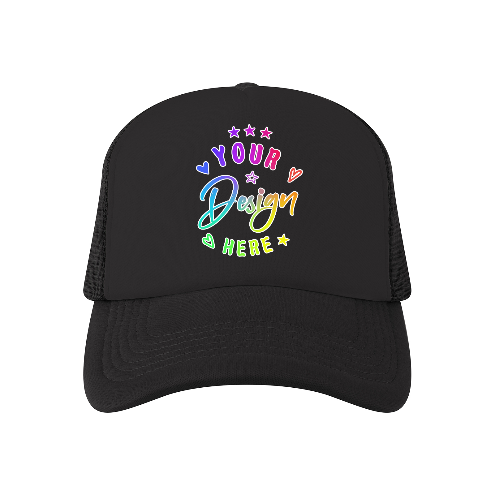 Custom Method: Heat Transfer printing. Enter text or upload your logo file, and then get your personality design on the caps!|Classic 5 Panel trucker caps, with foam front panel, corresponding color sweatband and polyester mesh back. Make it comfortable and breathable when wearing on.|Curved Visor, High Crown. The foam panel is about 4″High, and brim length is 3″. Good choice for Sun-protection.|Plastic Adjustable Snapback, matching with the cap color. Hat Circumference is adjustable, Approx. 22″ to 23 5/8″(56-60cm)|17 color options, suitable for any occasion. Good choice for PRESENTs to your family, friends.