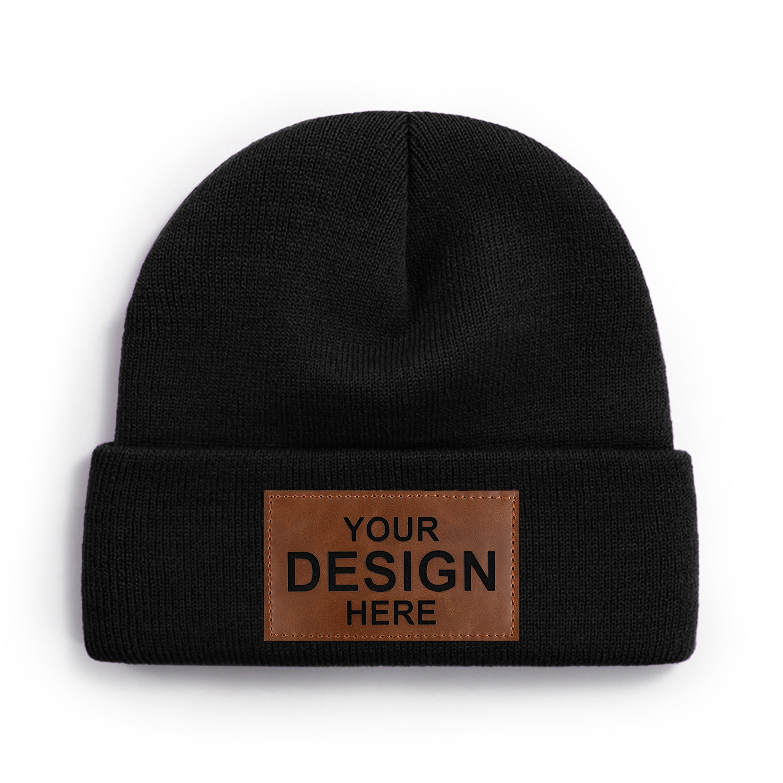 TOPTIE Custom Tan Rectangle Leather Patch Cuffed Beanie Knit Hat Cold Weather Knitted Skull Hats for Men Women